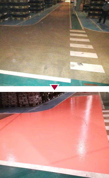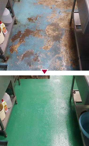 油や水で濡れている床にも直接塗ることができ、従来とは全く違う塗料です。