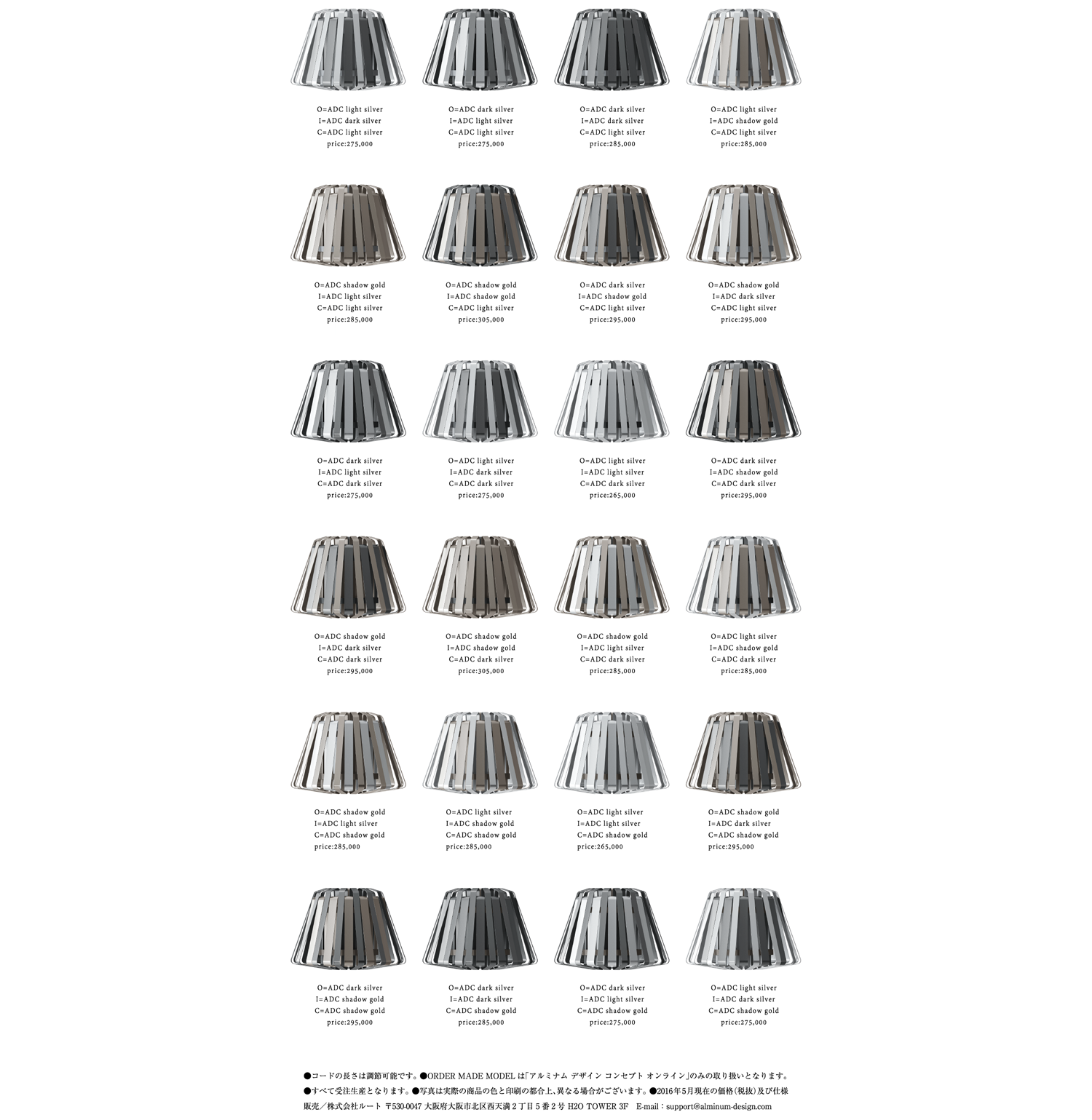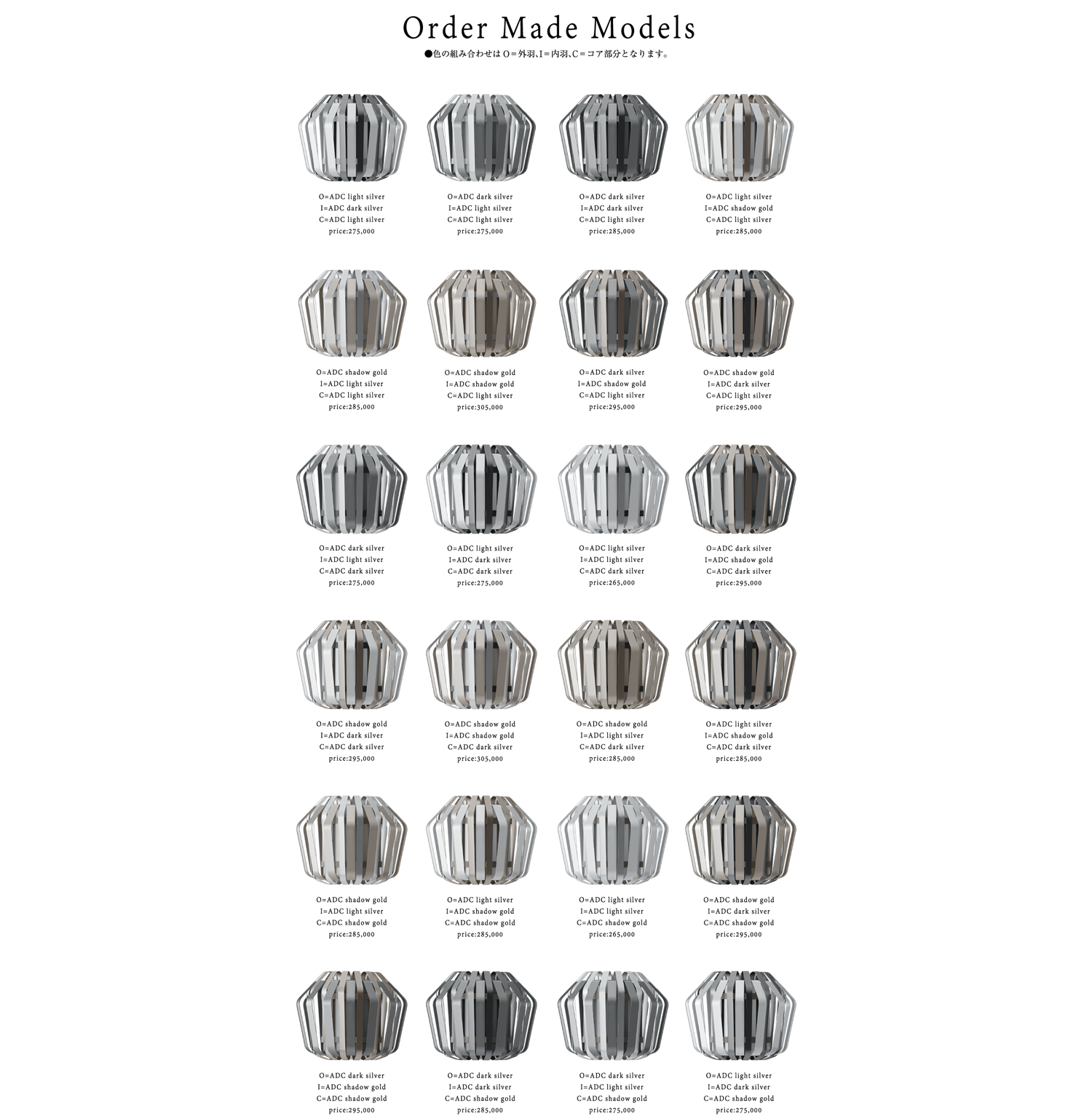 Aluminum is machined using unique processing by a master craftsman who works completely by handto adjust 15 inner blades, 15 outer blades and 15 core plates to create a lattice structure that hides the actual light source.This detailed machining and assembly requires approximately two months from order to finish.